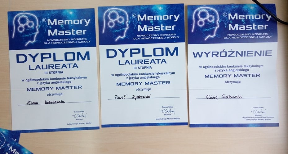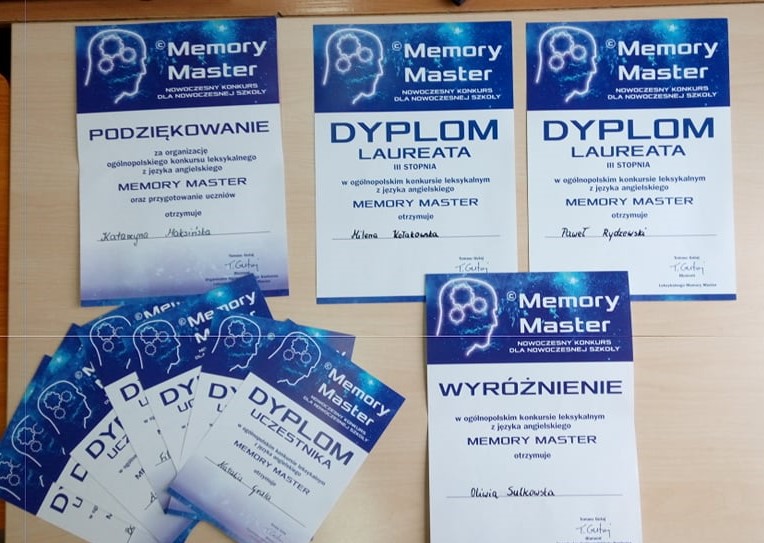 Za nami XVII edycja Ogólnopolskiego Konkursu Leksykalnego Memory Master. Z przyjemnością̨ informujemy, tytuł laureata w kategorii klasa czwarta w Ogólnopolskim Konkursie Memory Master uzyskali następujący uczniowie klas czwartych naszej szkoły: Paweł Rydzewski - laureat III stopnia 92 pkt. / 100 Milena Kołakowska - laureatka III stopnia 90 pkt. /100 Wyróżnienie w konkursie w kategorii klasa ósma otrzymała Oliwia Sulkowska kl. 8 87pkt./100 Wszystkim uczestnikom dziękujemy za udział w konkursie, a zwycięzcom serdecznie gratulujemy.
