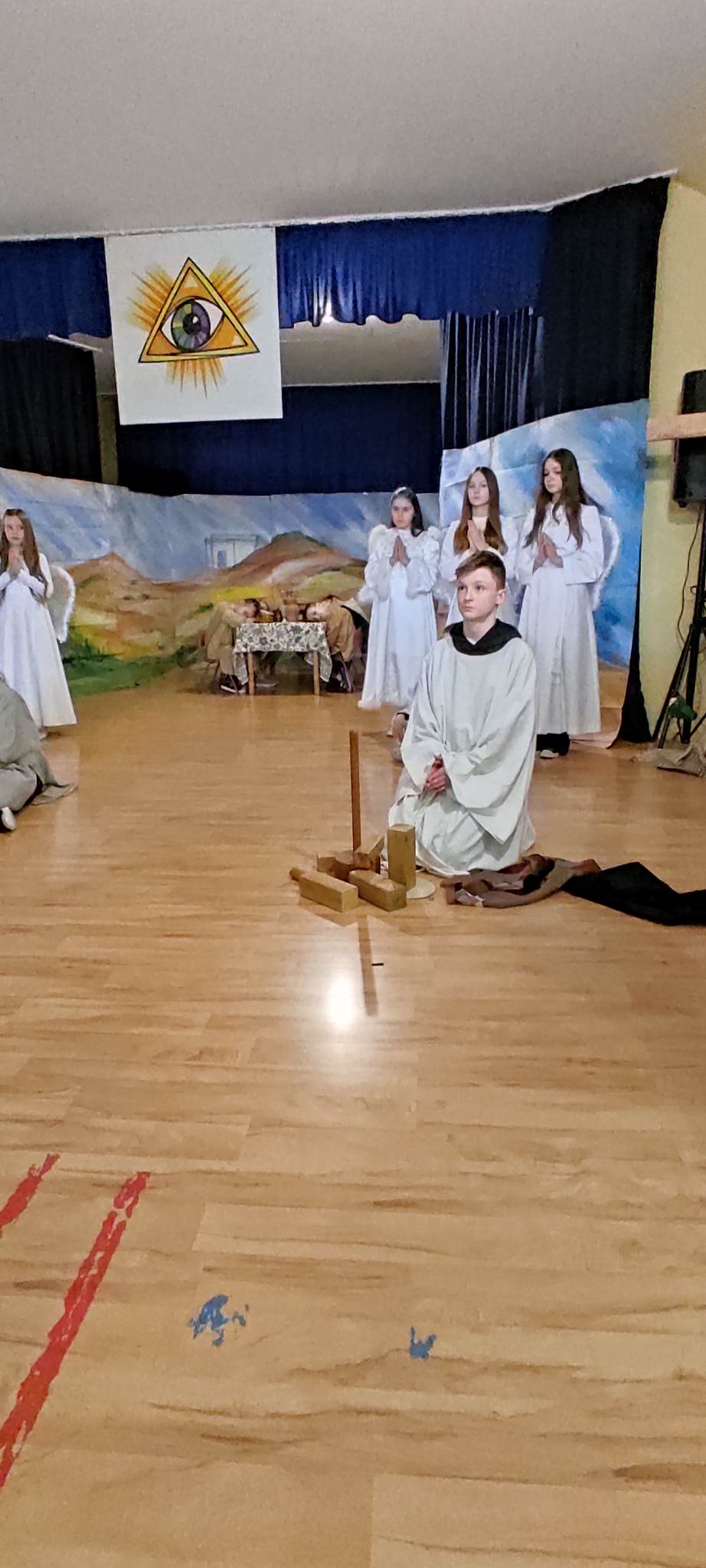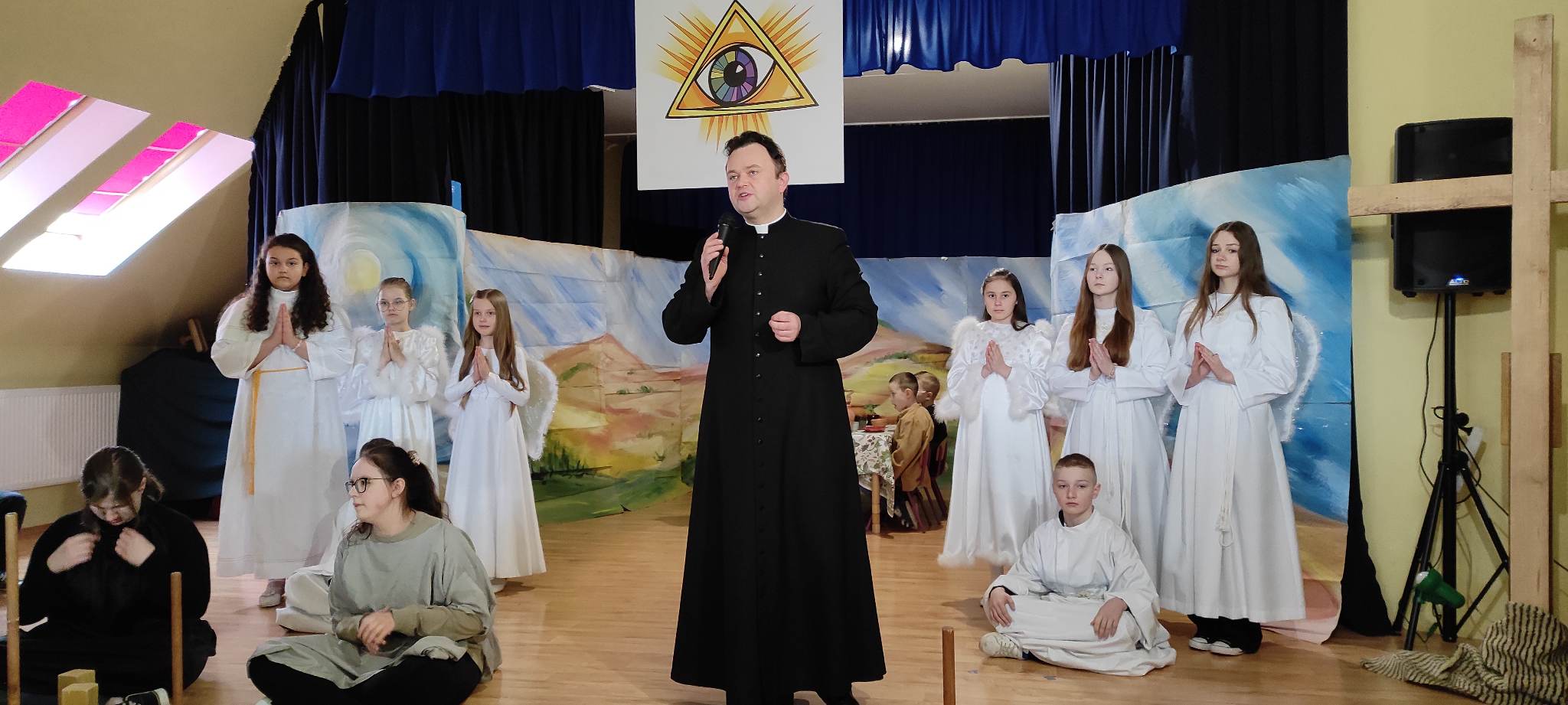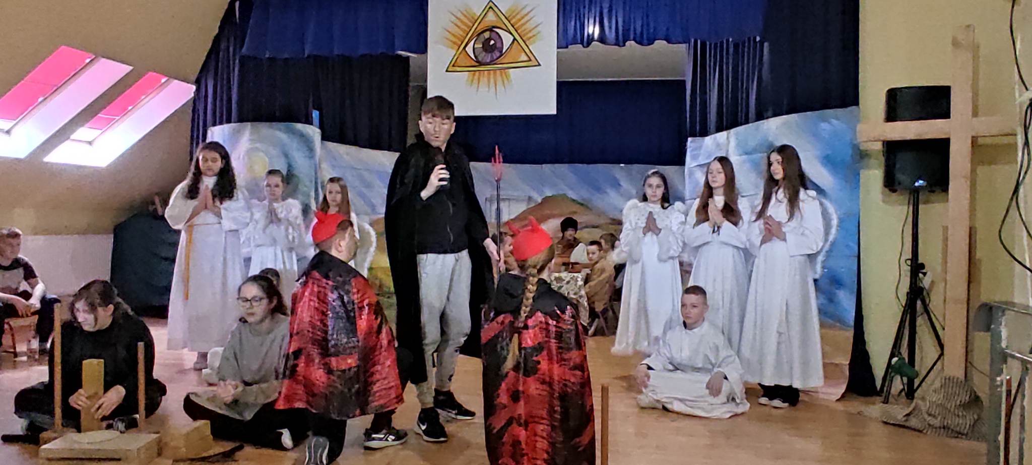 Następnie wszyscy udali się do szkoły, gdzie odbył się spektakl przygotowany również przez ks. Kazimierza Ostrowskiego pt. „Sens Cierpienia Niezawinionego”. To historia biblijnego Hioba, człowieka, którego spotkało wiele nieszczęść i wątpliwości, a pomimo tego został wierny Bogu.