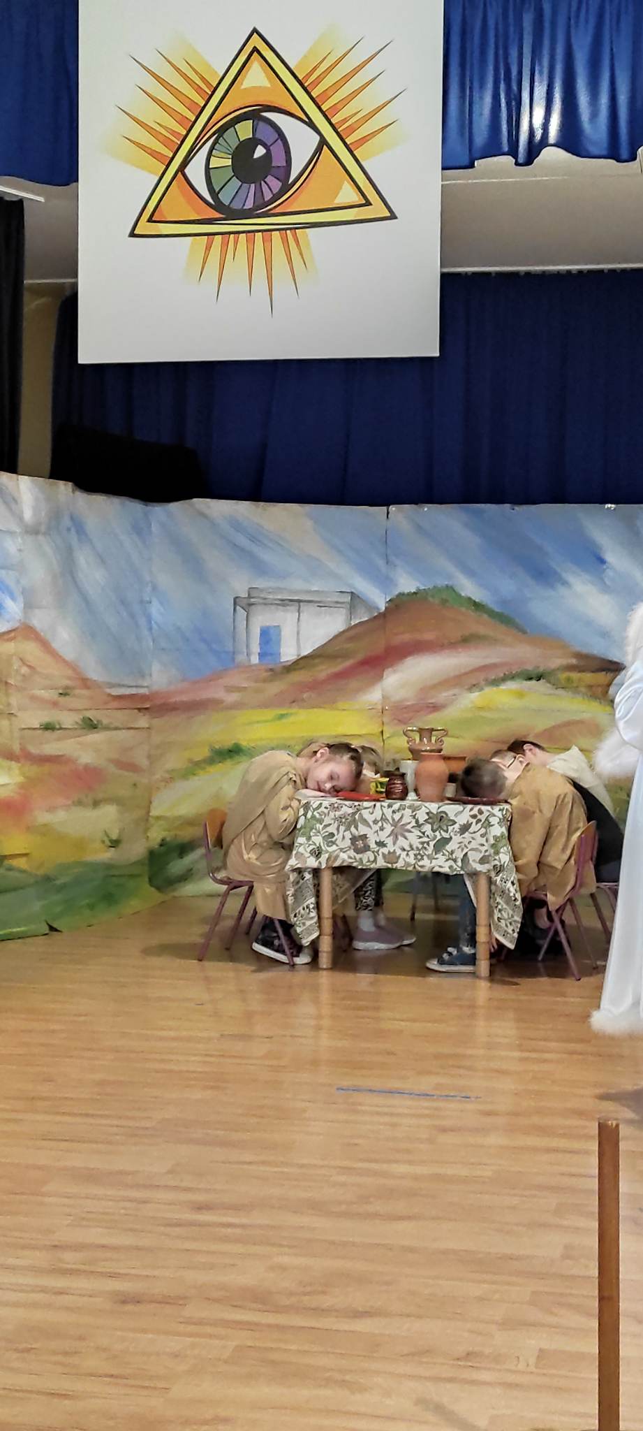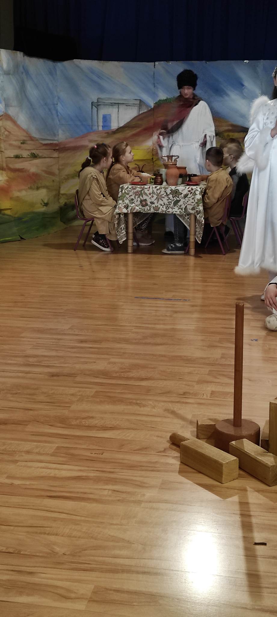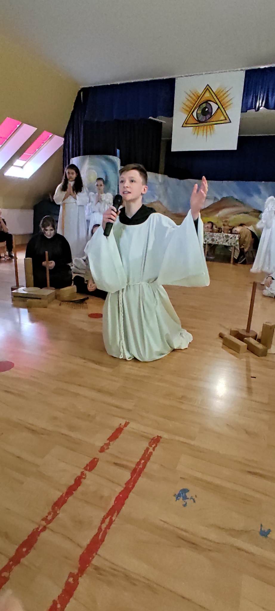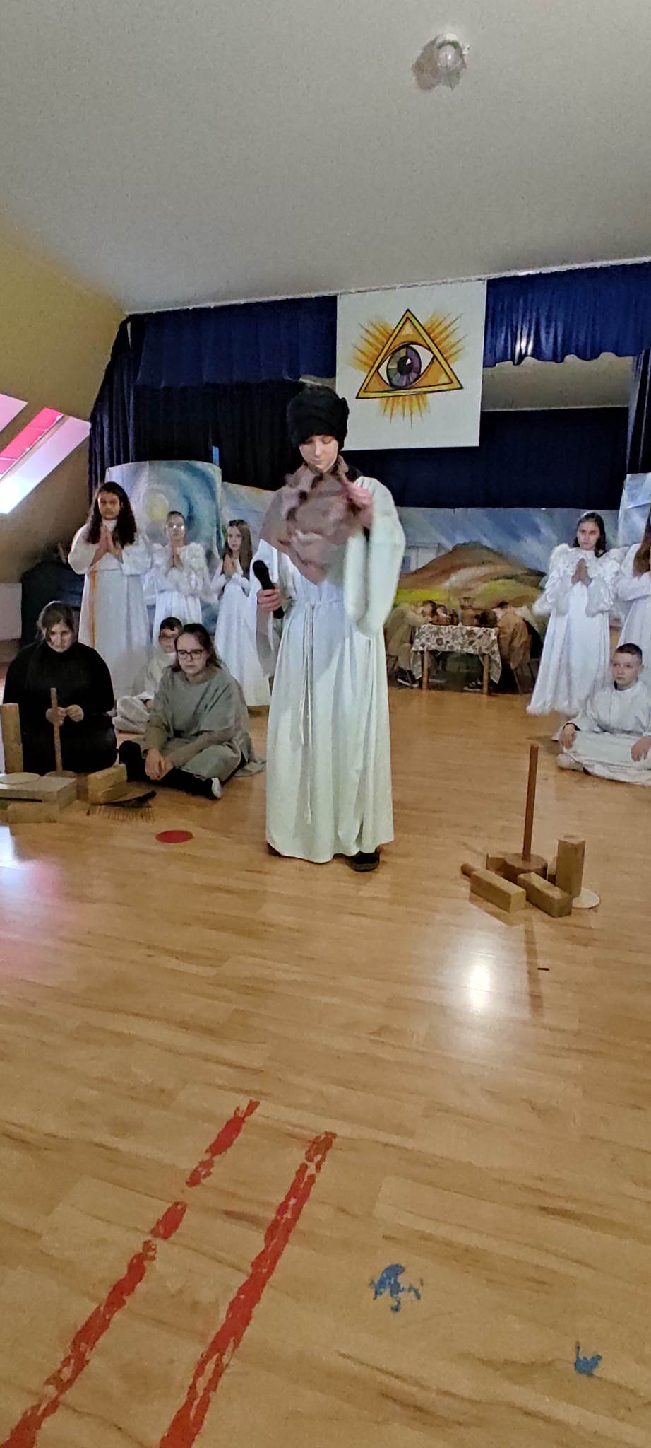 Następnie wszyscy udali się do szkoły, gdzie odbył się spektakl przygotowany również przez ks. Kazimierza Ostrowskiego pt. „Sens Cierpienia Niezawinionego”. To historia biblijnego Hioba, człowieka, którego spotkało wiele nieszczęść i wątpliwości, a pomimo tego został wierny Bogu.