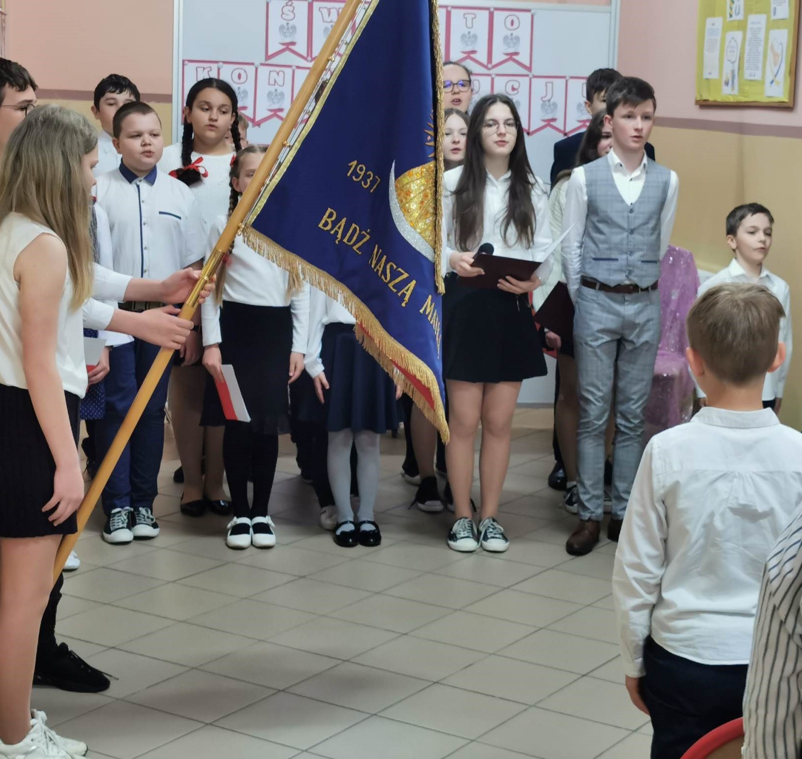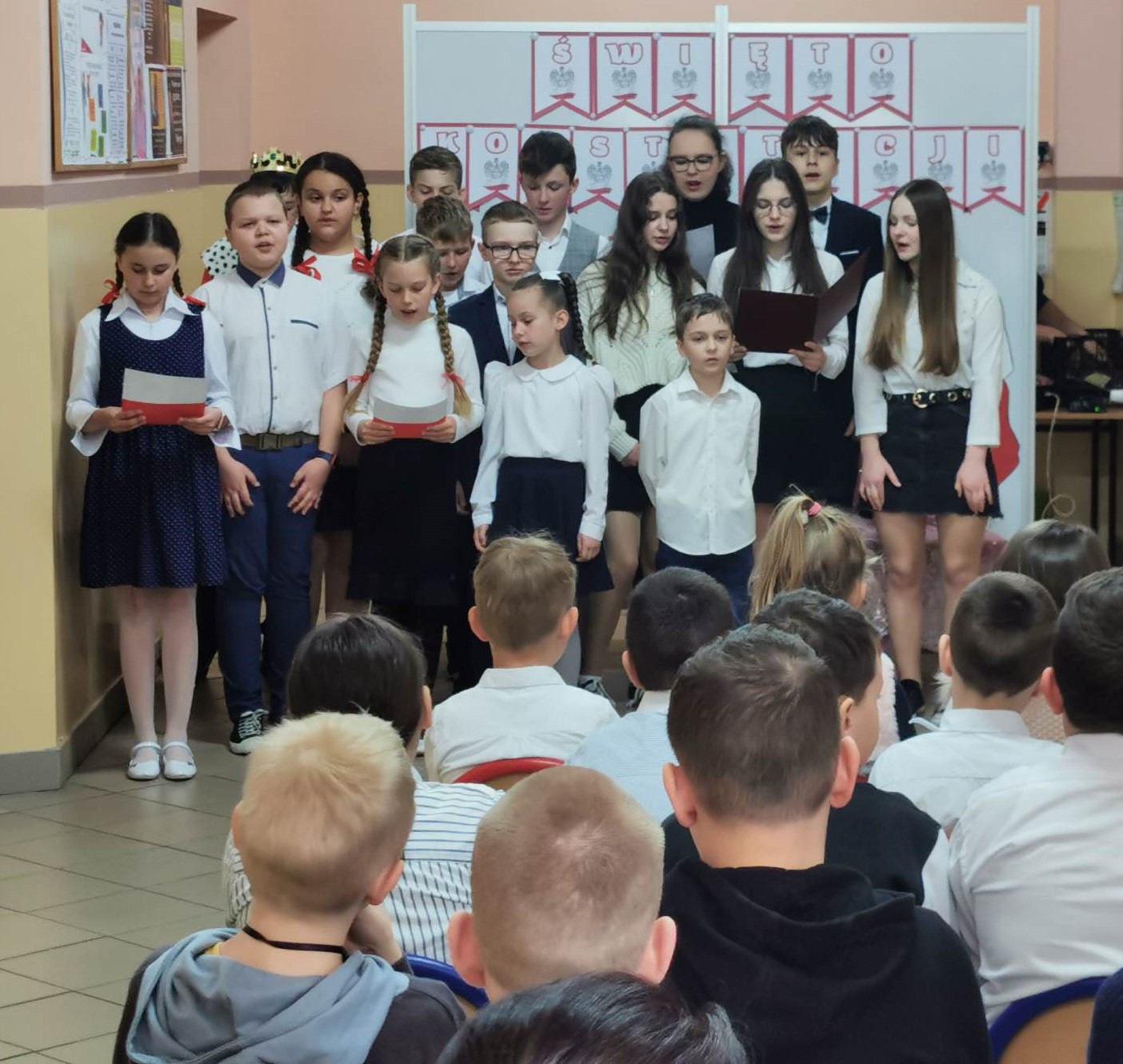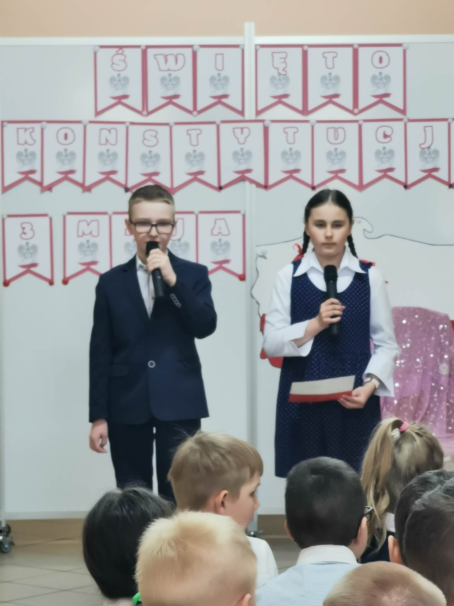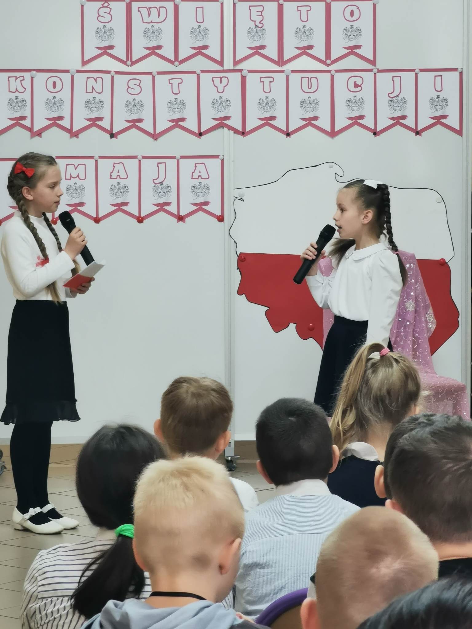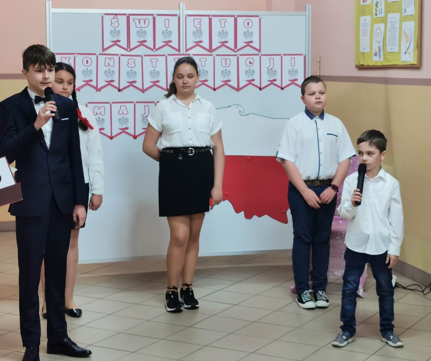,, Witaj majowa jutrzenko’’ oraz ,,Jestem Polką i Polakiem’’ oraz piękna piosenka patriotyczna napisana do słów Władysława Bełzy "Kto ty jesteś, Polak Mały’’, odśpiewane przez uczniów wprowadziły słuchaczy w klimat majowego święta.