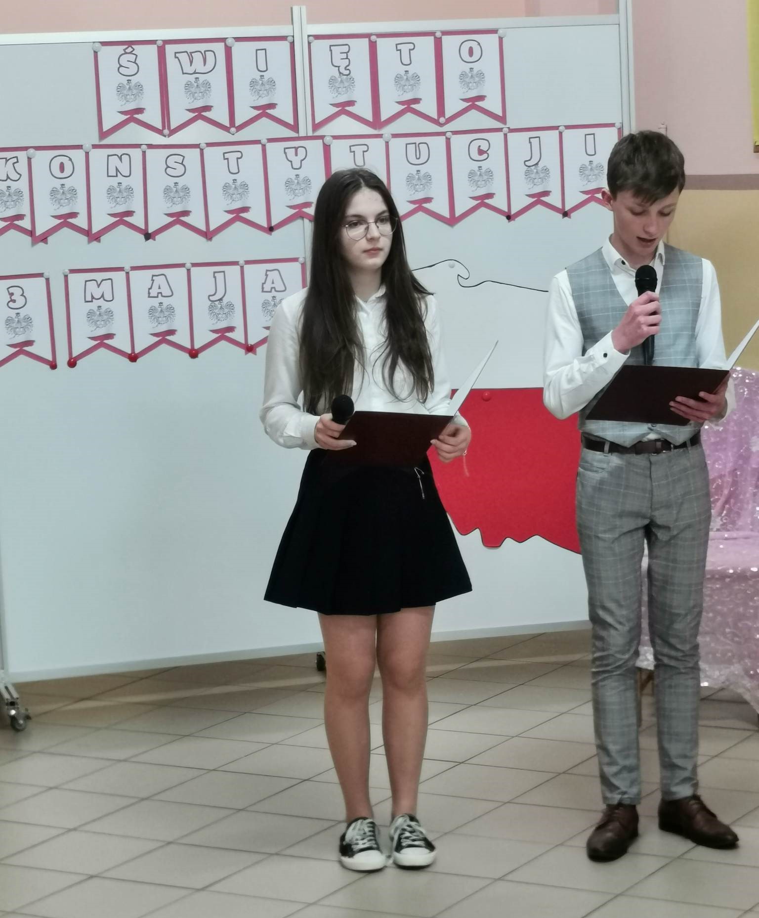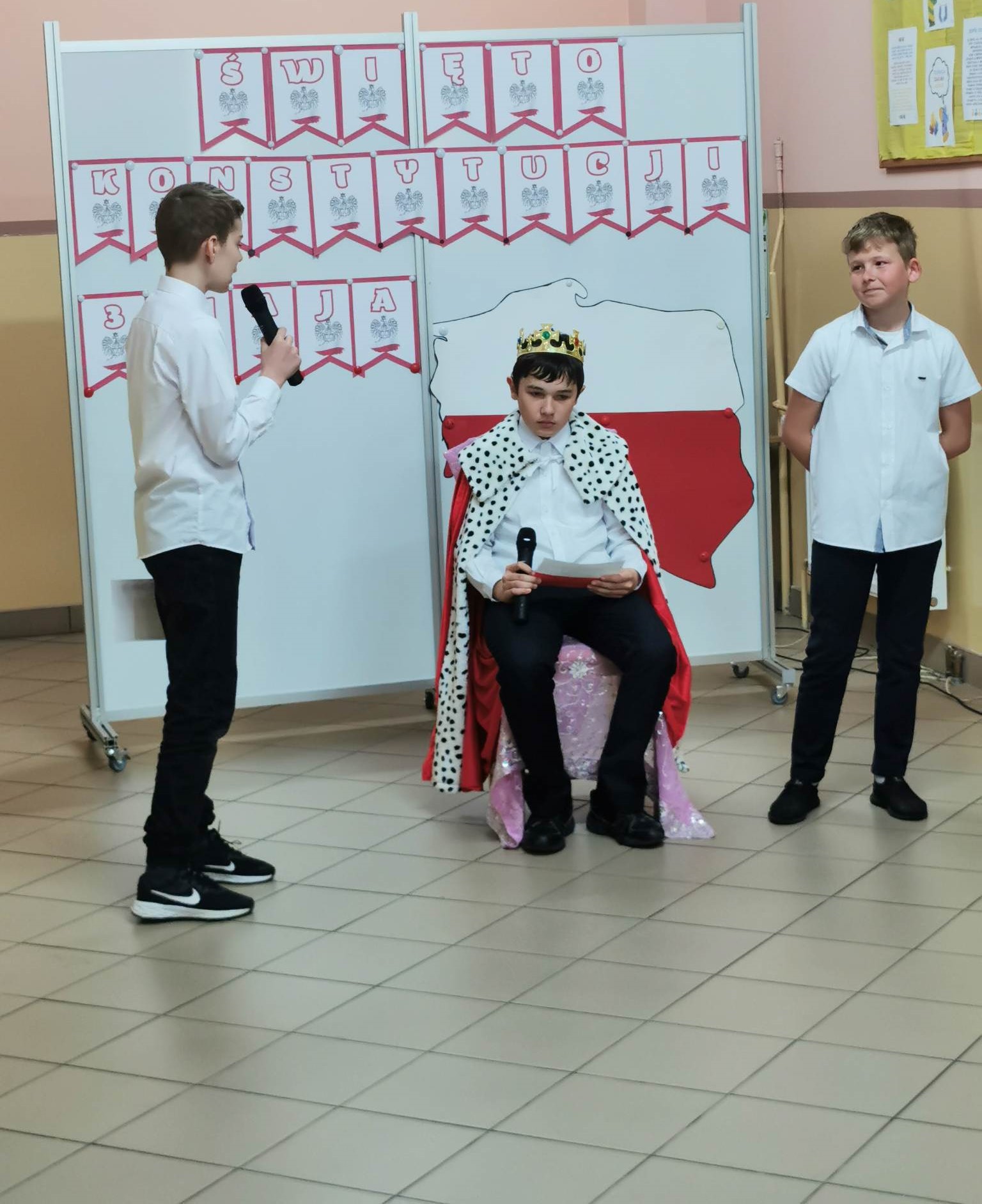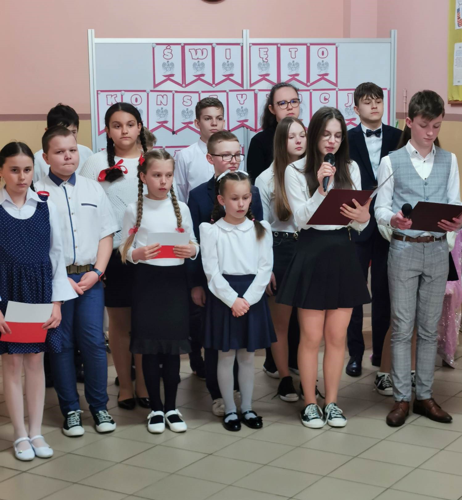 27.04.2023 społeczność naszej szkoły świętowała  kolejną rocznicę uchwalenia Konstytucji 3- Maja.  Aby upamiętnić ten doniosły fakt w historii Polski, uczniowie pod opieką pani Katarzyny Maksińskiej i pana Artura Piaseckiego, przygotowali montaż słowno-muzyczny o patriotycznej wymowie. Apel rozpoczęto odśpiewaniem hymnu państwowego oraz hymnu naszej szkoły. Zaprezentowano także historię konstytucji w krótkich scenkach m.in. z królem Stanisławem Augustem Poniatowskim, bezpośrednim świadkiem wydarzeń, związanych z uchwaleniem Konstytucji 3- Maja. Było to również okazją do przypomnienia uczniom ważnych faktów z historii Polski.